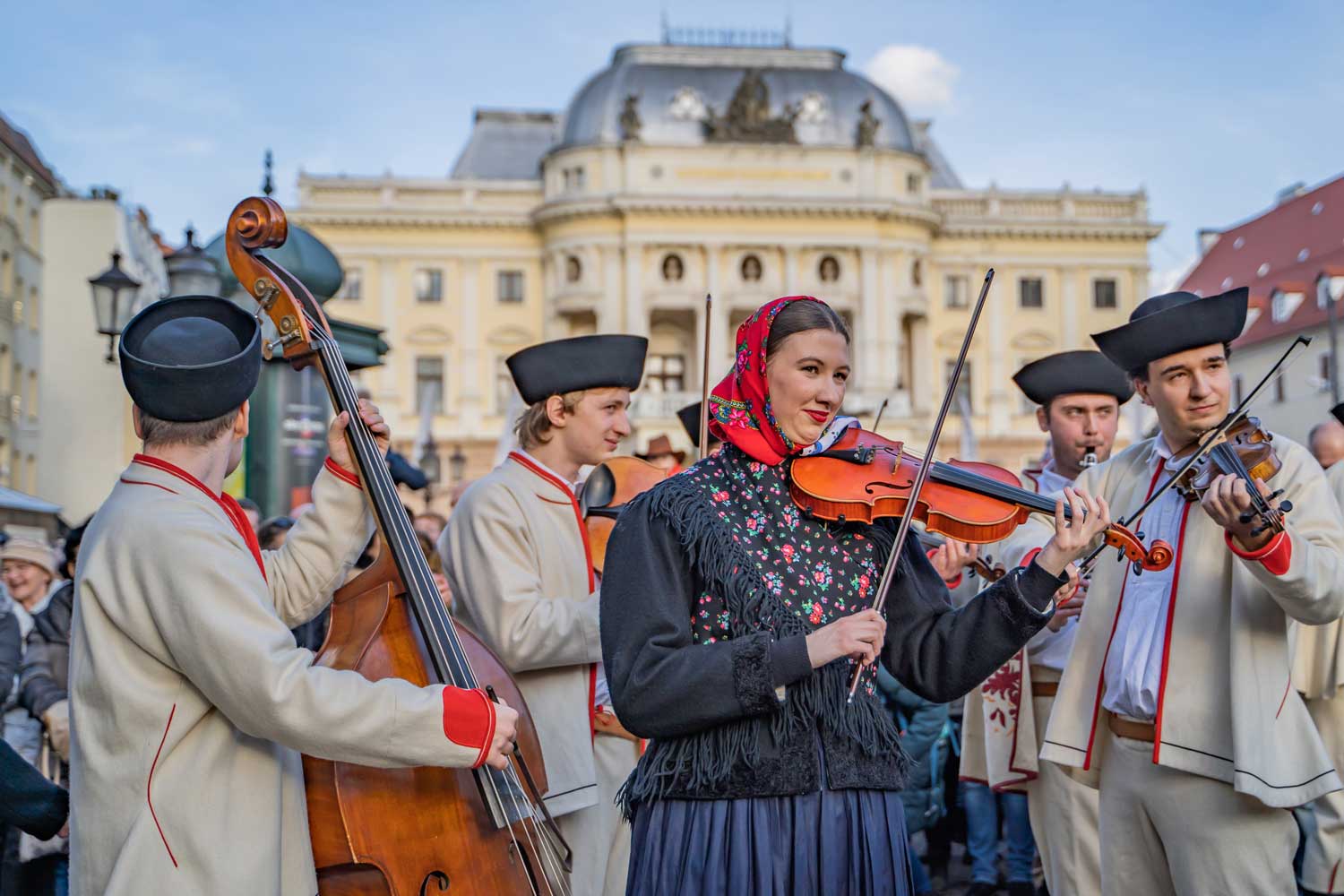Veľký fašiangový sprievod v maskách s hudobníkmi a tanečníkmi. Trasa viedla z Námestia Nežnej revolúcie cez Hviezdoslavovo nám., Zichyho palác, Hlavné nám., Primaciálny palác späť na Námestie Nežnej revolúcie